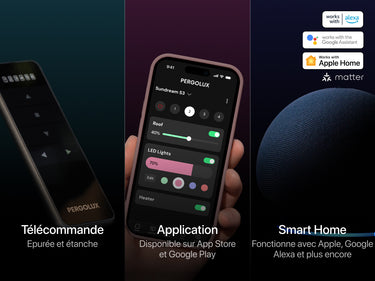 Fabriquée avec des matériaux haut de gamme, votre pergola est conçue pour résister aux intempéries les plus extrêmes, jusqu’à 150 km/h de vent — sans grincement et sans entretien